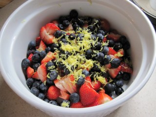 Firstly, preheat the oven to 200C/400F. Chop the strawberries into small chunks, so they’re not much bigger than the blueberries and sprinkle over the zest of a lemon and 1tsp caster sugar. put into an ovenproof dish.