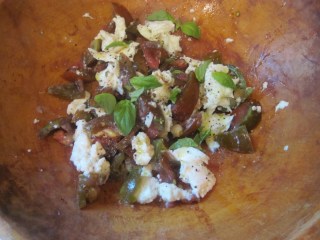 I wanted something salady too though so I went for the classic Caprese- mozzarella, tomato (in this case Black Russian heirloom ones) and basil. I usually add either spring onions or chives for a slight oniony flavour but i hadn’t been food shopping so that was a no go. As it’s such a simple salad, everything in it has to be great quality. Another good tip is to place the chopped tomatoes into a colander in the sink and sprinkle them liberally with salt. This ensures that some of the moisture is drawn out and the flavour of the tomato is concentrated, making the whole salad taste better.