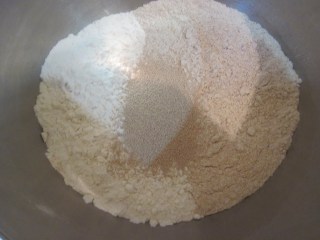 Put the sugar, salt and flours into a bowl, don’t sieve the wholemeal flour as you’ll separate the husk which you want, and add the yeast.