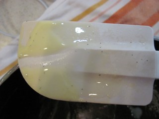 Pour half the hot cream onto the egg mixture and whisk before adding the whole lot back into the pan and stir over a low heat until it reaches coating consistency. This means that if you draw a line though the mixture on the back of a spoon, it holds, like this