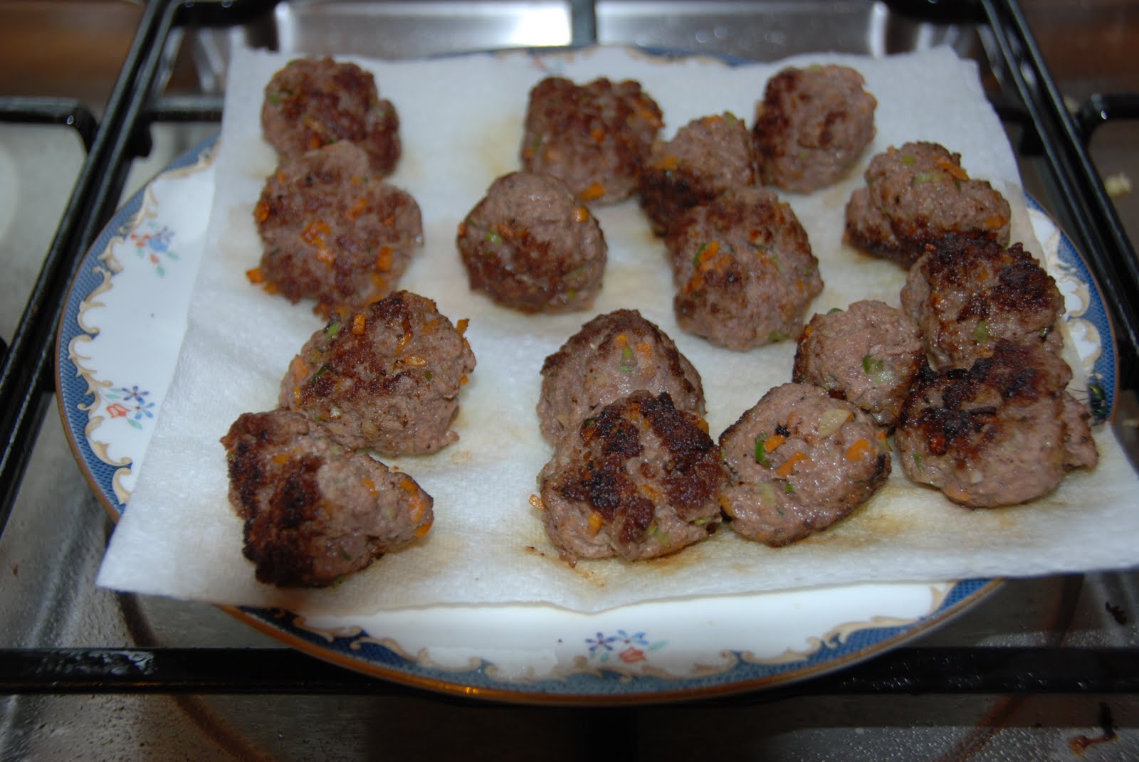 Fry the 1st four ingredients in a little oil until soft and then combine with the beef, chillis and spring onion. Smoosh everything up together so that you have a nice, even distribution of all the ingredients. Roll the mixture into balls about the size of large walnuts and fry on a high heat until they have a nice dark colour, you might need to do this in batches. Drain the meatballs on kitchen roll and set aside until you need them.
