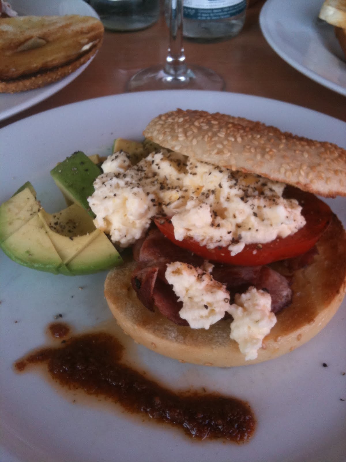 Scrambly egg with grilled bacon and tomato and some avocado on a seedy bagel. It was supposed to have cheese instead of avocado and poached egg instead of scrambled but i liked it this way, it made me feel a little less guilty as well which is always a good thing.
