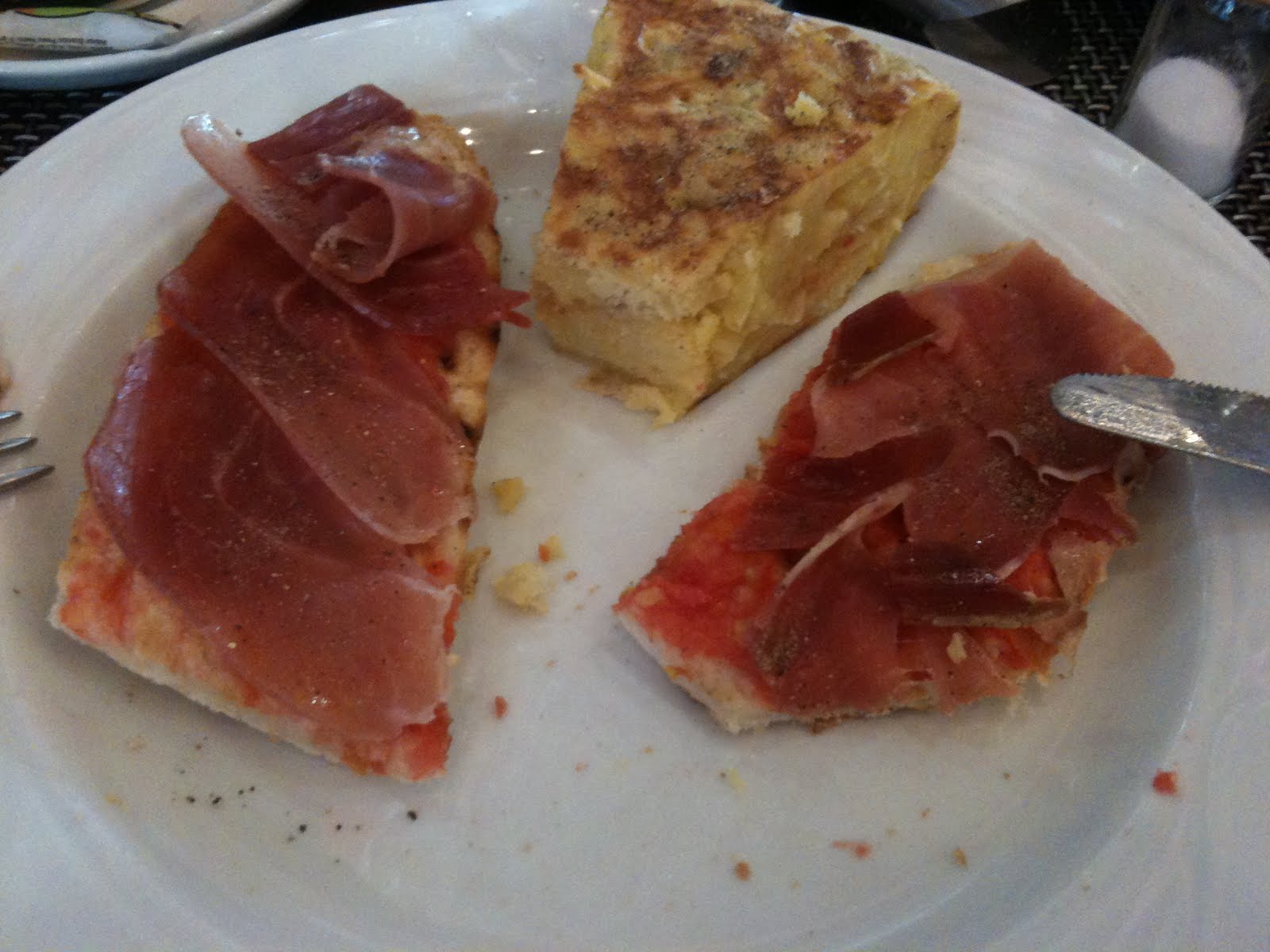 A few days later we popped up to la canada, a shopping centre up the road and, after doing a little shopping for the boyfriend i decided i was in fact pretty starving and wanting some breakfast/brunch/lunch. There wasn’t a great selection of restaurants so i picked a little cafe and thought i’d make do. And was really pleasantly surprised. Usually any place that has pictures on the menu scares me a little but this may just be the exception that proves the rule. They had loads of pastries and ice creams as well as salads and pizzas, but that wasn’t what caught my eye. One page of the menu had what was simply called Spanish brunches. The first one was what caught my eye, a relatively simple combination of bread smeared with tomato and topped with serrano ham served with tortilla. It really exceeded my expectations, the kind of thing that would really only be good in spain as the ingredients were all so fresh and full of flavour. Definitely something i’ll be bearing in mind for future lunches.