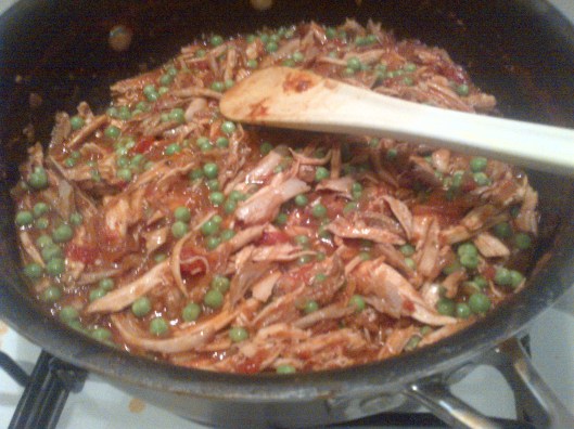 Add the shredded chicken and the peas and simmer until the sauce has thickened a little and everything is piping hot.