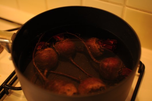 First up, trim the leaves off your beetroot, pop them in a pan and cover them with water. Boil them, with the lid on, until they’re tender.