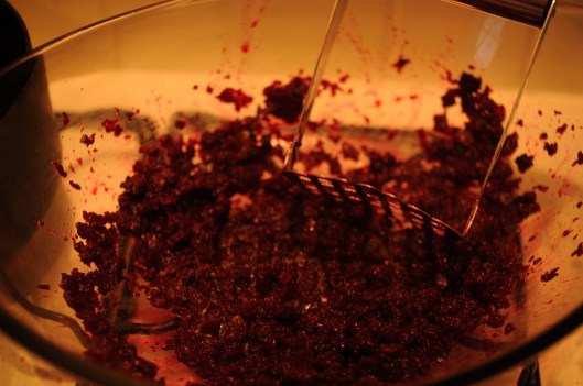Next up, mix the flour, salt and sugar through the mashed beetroot, you might want to smoosh it up a bit to make sure it’s fully mixed. It should end up looking a bit like this
