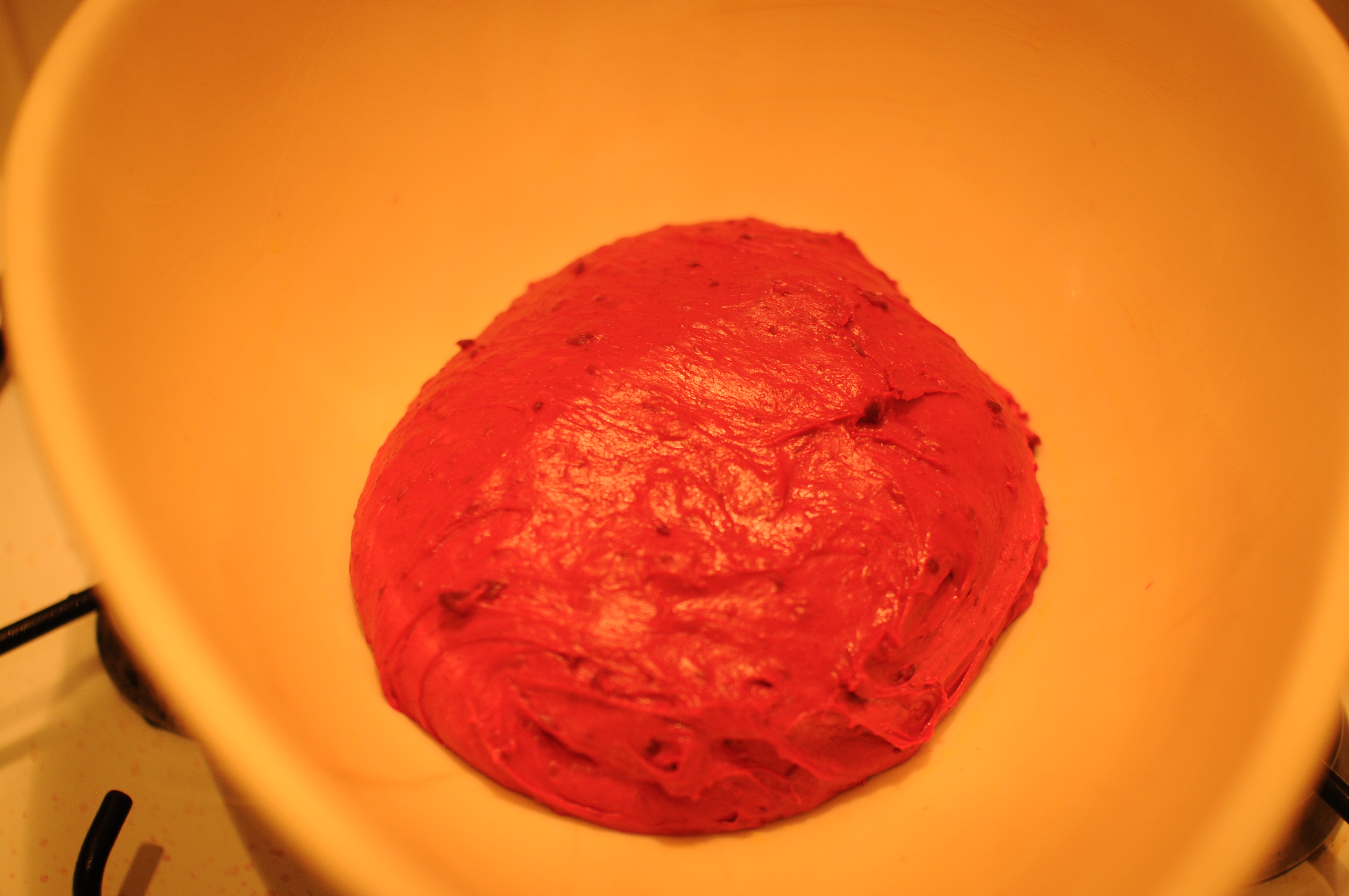 Now make a well in the centre and add the cooled, melted butter, the fresh yeast and enough of the beetroot cooking water to bring it all together. Knead it for 5-10 minutes until it’s smooth and even in colour, it might still be a tiny bit sticky but that’s ok. Form it in to a ball, place into an oiled bowl, cling film and leave in a warm place until it’s doubled it in size.