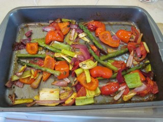 Lightly pan fry the peaches (no oil) until they soften slightly, this won’t take too long. Halve the cucumber lengthways and finely slice, do the same with the spring onions. Peel and trim the woody ends of the asparagus, wash the new potatoes. Boil or steam them both (bear in mind that the new potatoes will take longer, depending on how big they are) until just cooked. Quarter the new potatoes. Once the chicken is done, chop up the bacon and red pepper and then toss everything up together in a big bowl and dress with good olive oil and balsamic vinegar.